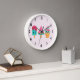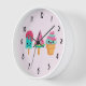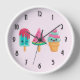 Un reloj con un ilustracion de 3 helados diferentes. Popsicle azul-verde con goteo de fresas y rociadores coloridos. Una pala de sandía. Un cono con capas de deliciosos helados en rosa y menta. Todo con sonrisas kawaii lindas.