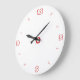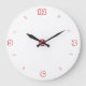 Un reloj de pared de cocina muy simple, fresco y blanco con números rojos en fuente x geométrica.