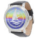 Relojes de diseño con diseño de velero blanco sobre fondo de color arcoiris. Un gran regalo para los amantes de la vela, el velero y los objetos náuticos. Elija entre muchos estilos de reloj y colores.