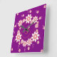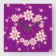 Relojes de pared de bonito con un patrón de remolinos y flores rosas sobre un fondo morado. Estos preciosos relojes personalizados vienen en 2 formas -cuadradas y redondeadas- y lucen encantadores en un dormitorio de chica.