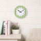 Reloj de pared de diseño de rayas modernas en un diseño de reloj decorativo de pared para la cocina, el comedor o cualquier habitación de su casa que quiera añadir un poco de color y carácter. Los colores son verde, blanco y negro.