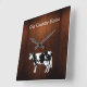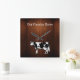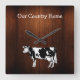 Aquí hay un reloj adorable de decoración de paredes de temática campestre con la imagen gráfica de una vaca y fondo de madera impreso digitalmente que se parece a una rica madera real para ese estilo rústico. Personalice el texto en el reloj que dice "nuestro país" para hacerlo suyo.