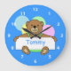 Relojes personalizados para los cuartos y los cuartos de niños de niños. El diseño fresco del oso de peluche se modifica para requisitos particulares con el nombre del niño.