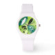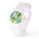 Relojes temáticos de verano para mujeres que presentan un fondo veraniego verde y acuático con siluetas blancas y negras de palmeras y tablas de surf. Las tablas de surf tienen salpicaduras de agua azul a su alrededor. Un gran regalo para cualquiera que ame el verano. ¡Hay muchos estilos para elegir! Los números de Watch se pueden borrar si prefieres tu reloj sin ellos.