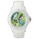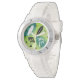 Relojes temáticos de verano para mujeres que presentan un fondo veraniego verde y acuático con siluetas blancas y negras de palmeras y tablas de surf. Las tablas de surf tienen salpicaduras de agua azul a su alrededor. Un gran regalo para cualquiera que ame el verano. ¡Hay muchos estilos para elegir! Los números de Watch se pueden borrar si prefieres tu reloj sin ellos.