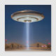 Un vaisseau spatial en forme de soucoupe volante planant au-dessus d'une installation militaire clôturée qui est supposée être la zone 51 ou area 51. Un puissant rayon lumineux descend du centre de l'OVNI vers l'entrée d'une zone restreinte, éclairant la nuit étoilée et l'espace désertique environnant.