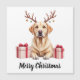 "Esta hermosa ilustración presenta un retrato detallado de un cariñoso Labrador Retriever amarillo con su característica cabeza ancha, expresión suave y pelaje dorado liso. Al perro se le da un encantador toque navideño con cuernos de reno adornados con pequeños adornos dorados y verdes/azules. Dos regalos de Navidad bellamente envueltos con cintas rojas se sientan de manera prominente a ambos lados. Esta gráfica de alta calidad es ideal para regalos personalizados de Navidad para dueños de Labradores, tarjetas de Navidad, ropa, adornos o cualquier producto que celebre esta raza de perro amigable y devota."
