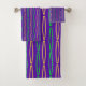 Este juego de toallas tiene un diseño geométrico de Mardi Gras de una especie de óvalos de punta plana que se repite a lo largo del diseño en oro y verde sobre un campo de púrpura.