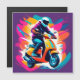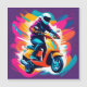 Una ilustración artística vibrante que muestra a un individuo montando un scooter naranja, rodeado de salpicaduras dinámicas de colores vívidos y movimiento. Captura temas de energía, creatividad y estilo de vida moderno.