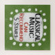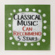 Un divertido diseño tipográfico que dice "Música clásica: puede recomendar, 5 estrellas". Es texto en negro y rojo sobre un rectángulo blanco con puntos blancos divertidos y juguetones rodeándolo, todo sobre un fondo verde.
