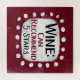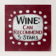 Un divertido diseño tipográfico que dice "Vino: puede recomendarse, 5 estrellas". Es un texto rojo negro y burdeos sobre un rectángulo blanco con puntos blancos divertidos y juguetones rodeándolo, todo sobre un fondo borgoñón.