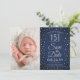 ¡El tiempo vuela! Invite a la familia y amigos a una elegante celebración de Quinceañera para ella con esta elegante 2 foto azul marino, gris y plata falsa 3.5"x5", salve la invitación a la cita. (IMAGEN PLACEMENT TIP: Una manera fácil de centrar una foto exactamente como quieres es recortarla antes de subirla al sitio web de Zazzle.) El diseño presenta dos fotos de entonces y ahora de su elección, caligrafía de escritura moderna, tipografía de arte de estilo vintage elegante y puntos de confeti de aspecto metálico purpurinoso. Tenga en cuenta que la plata es color impreso, no Relieve metalizado. Esta plantilla está configurada para una fiesta de cumpleaños número 15, pero se puede personalizar para cualquier edad o evento. El diseño moderno y único es perfecto para un chica adolescente. ¡Feliz cumpleaños Quinceanera! ¡Feliz cumpleaños 15!