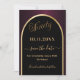 Una tarjeta Save the Date para una fiesta de cumpleaños número 90. Un fondo negro y burdeos, decorado con un arco dorado falso. Personalice y agregue una fecha y su nombre. El texto: Ninety y Save the Date se escribe con un gran guión a la moda de estilo con letras a mano.