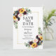 Elegante acuarela Mezcla Floral Guardar la tarjeta de Invitación Boda de compromiso de fecha incluye rosas de color burdeos, rosas rosas rosas rosas, rosas rojas, flores azules, girasoles y vegetación botánica sobre un marco dorado.