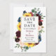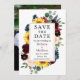 Moderno y elegante acuarela Floral Save The Date Card incluye rosas de color burdeos, rosas rosas rosas, flores azules, flores rojas, girasoles, hojas de eucalipto y vegetación botánica sobre un marco dorado. Foto de vuelta.