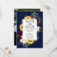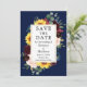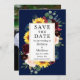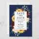 Moderno y elegante acuarela Floral Save The Date Card incluye rosas de color burdeos, rosas rosas rosas, flores azules, flores rojas, girasoles, hojas de eucalipto y vegetación botánica sobre un marco dorado. Fondo Azul. Foto de vuelta.