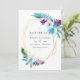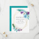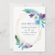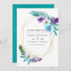Colorida acuarela de hojas tropicales y orquídeas para boda con marco geométrico dorado y lavado de acuarela azul turquesa al revés.