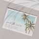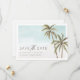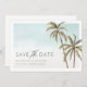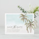 Moderna temática de playa tropical salva las tarjetas de fecha, perfecto para anunciar su boda temática de playa tropical. Cielo azul y fondo de degradado de arena con nuestras palmeras tropicales acuáticas. "Save the date" está bellamente diseñado en san serif y tipografía de guiones. Personalizar con sus nombres, fecha y ubicación. Obra de arte pintada a mano por Moodthology Papery