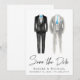 Anuncio de guardar la fecha de boda para hombres gays elegante y chic sin foto con dos acuarelas de esmoquin gris y negro con acentos azules y "Guardar la fecha" en una tipografía moderna. Agregue sus nombres, fecha de la boda y ubicación.