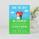Este divertido, único y deliciosamente geeky salva la invitación del boda de citas que tiene una novia de 8 bits (con el pelo rubio) y personajes del novio mirándose el uno al otro frente de un corazón rojo, con un cielo azul brillante con nubes blancas de 8 bits.