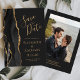 El borde izquierdo de esta elegante tarjeta moderna para guardar la fecha de la boda presenta un borde de ágata de acuarela negra recortado con brillo dorado falso. El texto personalizable combina caligrafía de color dorado, fuentes copperplate e itálicas sobre un fondo negro claro. En el reverso, reemplace fácilmente la imagen de muestra con una foto de los futuros novios, y agregue algunas líneas de información adicional, como la URL del sitio web de su boda.