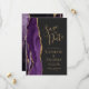 El borde izquierdo de esta elegante y moderna boda, salvo la tarjeta de fecha, cuenta con un borde de batido color morado con falso purpurina de oro. El texto del personalizable combina la escritura a mano de color dorado, las fuentes de copperplate y cursiva sobre un fondo negro de pizarra. El reverso presenta un diseño de agate morado y dorado a juego.