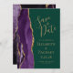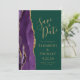 El borde izquierdo de esta elegante y moderna boda, salvo la tarjeta de fecha, cuenta con un borde de batido color morado con falso purpurina de oro. El texto del personalizable combina la escritura a mano de color dorado, el copperplate y las letras cursivas en un fondo verde esmeralda. El reverso presenta un diseño de agate morado y dorado a juego.