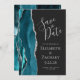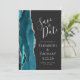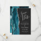 El borde izquierdo de esta elegante y moderna boda, salvo la tarjeta de fecha, cuenta con una verde azulada barra de acuarela azul recortada con purpurina de imitación plateado. El texto del personalizable combina la escritura a mano gris plateado, el copperplate y las fuentes cursivas en un fondo negro de pizarra.