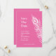 Unas plumas de pavo real claras y brillantes adornan esta invitación de una nueva forma de moda. Esta opción Guardar la fecha forma parte de la colección completa de bodas Agitar las plumas de cola y está disponible en una variedad de colores. Se muestra en el papel básico; sin embargo, recomiendo el peso y textura del papel de lino.