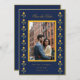 Tarjeta de guardar la fecha amarilla y azul marino con borde de caléndula de acuarela con foto de la pareja.