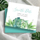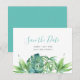 Anuncie su compromiso con estilo con esta elegante tarjeta de "save the date" sin foto, una opción ideal para una boda de playa en Florida o cualquier boda de destino. Con mis originales hojas tropicales pintadas a mano con acuarela (palma y monstera), este diseño combina la belleza natural con un encanto moderno.