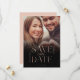 Ficha moderna y minimalista para guardar la fecha de la foto de guardar la fecha de la boda. El diseño presenta una foto completa moderna para mostrar tu propia foto especial. "Guarda nuestra fecha" se muestra en un diseño de tipografía de falso foil de oro rosa moderno con nombres y nueva fecha de boda. La superposición de la foto con gradiente negro añade un toque de lujo.