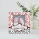 Anuncio de Ahorre la fecha de boda personalizado de damasco negro blanco rojo. La parte superior es de patrón de damasco rojo y blanco y la parte inferior es de negro y blanco. Una franja roja separa las dos partes. Su texto se escribe en una etiqueta elegante con contorno blanco y rojo.