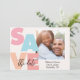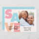 Los tonos tropicales se combinan para una tarjeta de "Ahorre la fecha" de verano, playa, moderna y romántica. La parte delantera de la tarjeta presenta la foto de la pareja rodeada de un marco blanco. El texto "la fecha" se sienta en "GUARDAR" en texto de escritura negra. . La parte trasera de la tarjeta es un fondo sólido, azul tropical claro y en blanco.