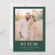 Esta invitación de guardar la fecha de la boda presenta un diseño rectangular con una fotografía central bordeada por un marco verde oscuro sólido, que captura a dos personas en un entorno al aire libre durante el atardecer o el amanecer. La paleta de colores incluye tonos terrosos de beige suave, verdes apagados y dorados cálidos, creando un tema de elegancia rústica. El diseño utiliza tipografía sans-serif en negrita para espacios personalizables, lo que mejora su atractivo moderno. El ambiente es alegre y festivo, perfecto para anunciar su día especial con un toque de belleza natural.