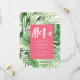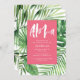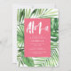 Invitaciones modernas a fiestas folclóricas con hojas de palmera tropicales. Texto del guión de efecto pintado a mano. Parte de una colección de verano sobre tendencias. Se puede cambiar el color rosa claro de la chica.