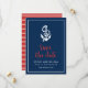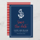 Elegante Save the Date Náutico con un ancla y las palabras "save the date" en una elegante escritura roja sobre un fondo azul con un borde blanco. La tarjeta tiene un patrón de rayas blancas sobre un fondo rojo en la parte posterior. Echa un vistazo a otros artículos de boda aquí https://www.zazzle.com/rosewoodandcitrus/gifts?cg=196540141241316965&rf=238364477188679314