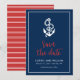 Elegante Save the Date Náutico con un ancla y las palabras "save the date" en una elegante escritura roja sobre un fondo azul con un borde blanco. La tarjeta tiene un patrón de rayas blancas sobre un fondo rojo en la parte posterior. Echa un vistazo a otros artículos de boda aquí https://www.zazzle.com/rosewoodandcitrus/gifts?cg=196540141241316965&rf=238364477188679314
