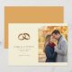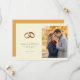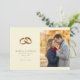 Esta invitación de guardar la fecha de la boda presenta un diseño de página dividida con elegantes anillos de boda dorados en un lado y una acogedora foto de otoño de una pareja abrazándose en el otro. El diseño utiliza una paleta de colores suaves y terrosos, que incluye beige, dorado, marrón y verdes apagados, creando una atmósfera cálida y romántica. La tipografía es limpia y clásica, lo que realza el tema general de elegancia atemporal. Perfecta para parejas que buscan establecer un tono tierno e íntimo para su próxima boda, esta plantilla combina el minimalismo moderno con imágenes emotivas.