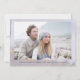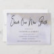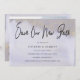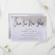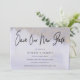 Un suave lavado de color azul / púrpura cubre ambos lados de esta elegante tarjeta Save Our New Date. El purpurina de oro decora la parte superior del frente y la parte inferior de la parte trasera. En la parte delantera, Save Our New Date se escribe en una gran fuente de escritura moderna y luego tus nuevos detalles de boda siguen en un elegante texto en serif. Tu foto favorita está en la parte de atrás. Sus nombres, fecha de boda y ubicación se encuentran a continuación.
