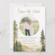Fotografía de la boda cristiana La tarjeta Save the Date representa un diseño de acuarela natural simple que incluye pinos y montañas forestales en tonos tierra de sabio, verde y bronceado. En la parte de atrás aparece la cita inspiradora de un boda: "Dos vidas unidas en la amistad, dos amigos unidos en el amor, un amor unido en Cristo".