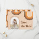 Sorprende a tus invitados con esta genial tarjeta de Save the Date retro, que incluye arcoíris boho, una foto arqueada y tipografía de los 70. Agrega tus detalles fácilmente haciendo clic en la opción "personalizar esta plantilla".