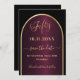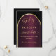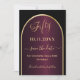 Una tarjeta Save the Date para una fiesta de cumpleaños número 50. Un fondo negro y burdeos, decorado con un arco dorado falso. Personalice y agregue una fecha y su nombre. El texto: Fifty y Save the Date está escrito con un gran guión de moda a mano.