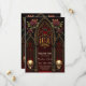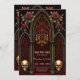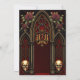 Arco gótico con calaveras. Un gran arco gótico se alza majestuosamente sobre un fondo rojo misterioso y profundo, decorado con detalles ornamentales. Los dos grandes pilares, adornados con delicados tallados, dan a la imagen una elegancia conmovedora. En el centro del arco brilla una impresionante vidriera, cuyo motivo central es una araña, símbolo de paciencia y creatividad. Rodeado por dos cráneos dorados, que recuerdan tanto a la transitoriedad como al amor eterno, el arco cautiva al espectador y promete una celebración llena de misterio y fascinación.