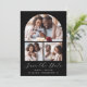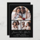 Esta sencilla y minimalista tarjeta Save the Date incluye un arco de collage de 3 fotos encima de las palabras "Save the Date" en un elegante guión de escritura a mano en blanco, seguido de los nombres de la pareja, la fecha boda y la ciudad en letra sans serif en un fondo negro. Añada un mensaje más detallado con información adicional sobre la marcha atrás.