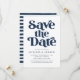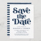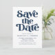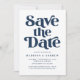 Moderno guarde la tarjeta de fecha con "Save the Date" que se muestra en negrita con letras de la marina con fondo blanco. Personalice el estilo para guardar la tarjeta de fecha con sus nombres, fecha de boda, ubicación, sitio web del boda y otros detalles importantes del boda.