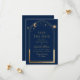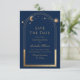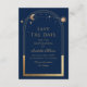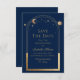 El Celestial Blue Save The Date Birthday Quinceanera Invitation presenta un marco dorado de sol, luna y estrellas sobre un fondo azul. Dentro está su personalizado Quinceanera guardar la información de fecha. Personalice editando el texto en los cuadros de texto. Diseñado para usted por ©2024 Evco Studio www.zazzle.com/store/evcostudio