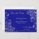 Un diseño impresionante con florituras ornamentadas gris plateado y flores diminutas. Sobre un fondo azul agradable, esta tarjeta de "guarda la fecha" es ideal para un esquema de color de boda azul. El texto diagonal intencional sigue las líneas del diseño. Si has decidido que azul y plateado sean tus colores principales de boda, esta es una elección perfecta.