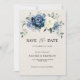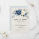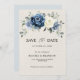 Tarjeta de boda floral azul polvo para guardar la fecha con un elegante ramo de azul marino, azul real, blanco, dorado, champán marfil, rosa desmayado, capullos de ranunculus y hojas de eucalipto verde salvia y elegante ramo de acuarela. Por favor, contacte conmigo para cualquier ayuda en personalización o si necesita cualquier otro producto con este diseño.