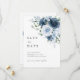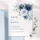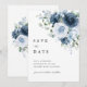 Tarjeta de anuncio de fecha de boda elegante en azul polvoriento y azul marino con detalles de serif clásicos y una paleta de azul suave y romántico. Diseñada para parejas que desean una primera impresión elegante y atemporal, esta maquetación combina el espaciado minimalista moderno con flores pintadas para un aspecto perfectamente equilibrado.
